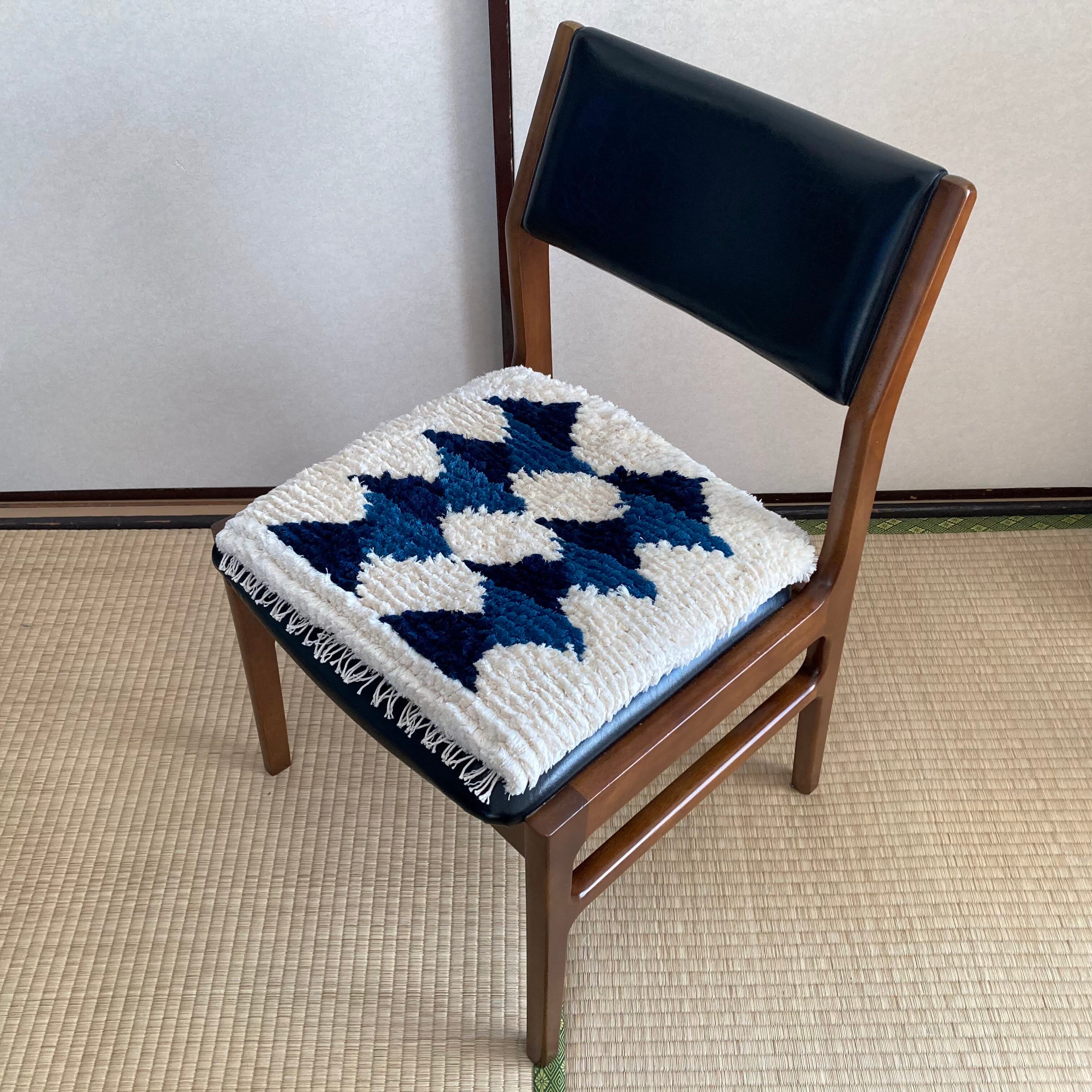 ノッティング織の技法で作った椅子敷です。白い綿糸と藍で染めた綿糸を用いています。